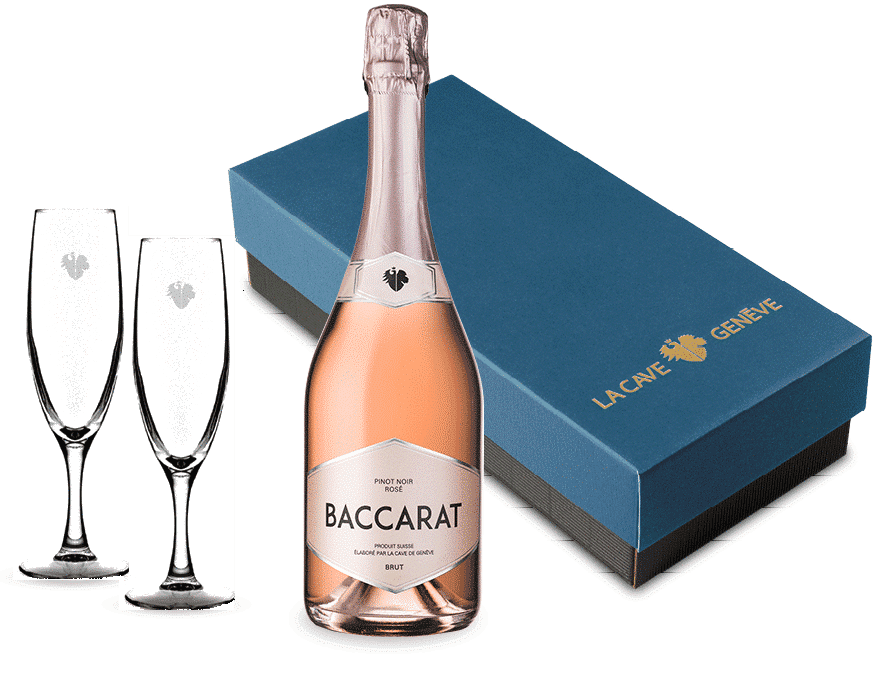 Médaillé d’argent à l’occasion du Concours Mondial de Bruxelles 2023 et du Grand Prix du Vin Suisse 2023, l’irrésistible Brut Rosé de notre gamme Baccarat charme les papilles des gourmets les plus exigeants. Des bulles fines et persistantes dotées de notes fruitées et florales qui se révèlent idéales à l’apéritif ou pour accompagner des mets délicats tels que le saumon et les desserts aux fruits rouges. Accompagné de 2 élégantes flûtes, le coffret Baccarat est parfait à partager à deux.