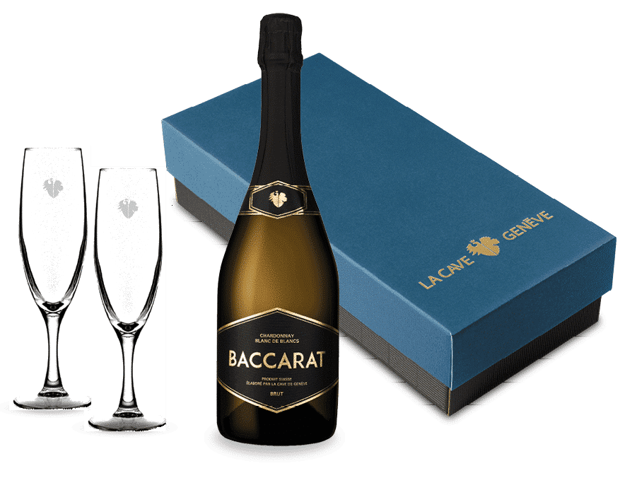 Médaillé d’or à l’occasion du concours Best of Swiss Wine 2021 et du Concours International des Meilleurs Effervescents du Monde 2023, l’irrésistible Brut Blanc de Blancs de notre gamme Baccarat charme les papilles des gourmets les plus exigeants. Des bulles fines et persistantes dotées de notes fruitées et florales qui se révèlent idéales à l’apéritif ou pour accompagner des mets délicats tels que le saumon et le foie gras. Accompagné de 2 élégantes flûtes, le coffret Baccarat est parfait à partager à deux.